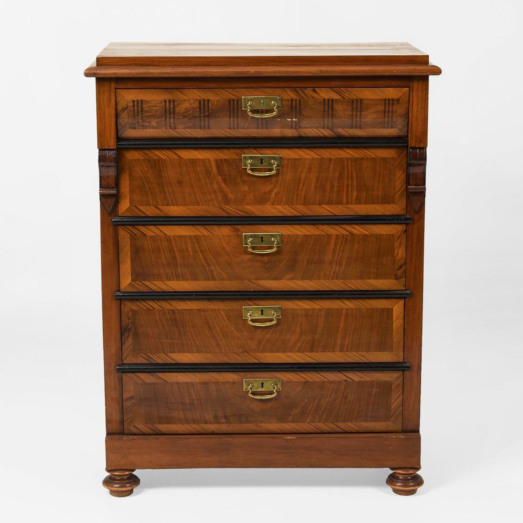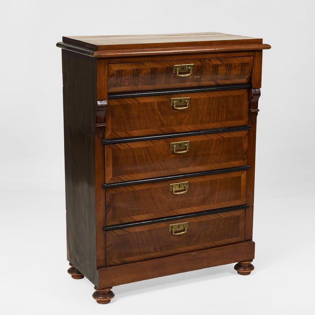 5-bay chest of drawers with stepped top plate and turned feet, head drawer highlighted by marked fluting profile; decorated with discreetly delivered moldings and brass fittings in Art Nouveau ornamentation. Slight signs of age / use.