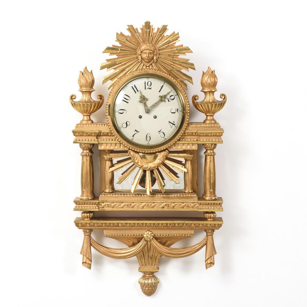 Wall clock designed in Baroque style with crowning sun symbol, lateral fire urns, mirrored back and console piece with festoons and cone decoration. Inside handwritten inscribed and dated "1922". Light signs of age and wear, partial small defects.