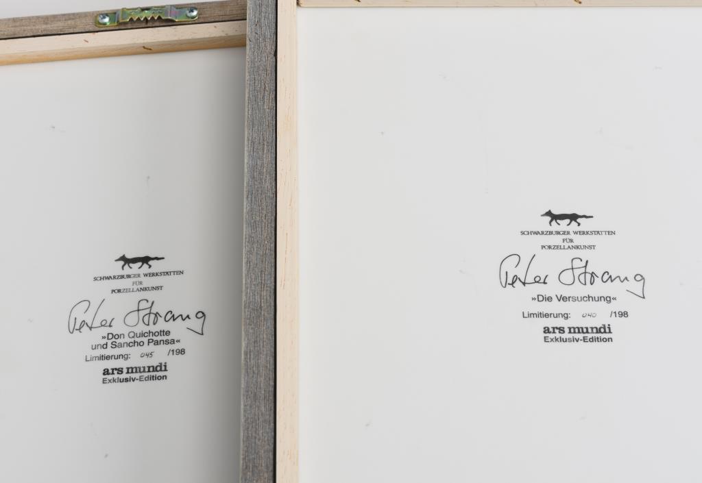 Rechteckige Platte, 1x mit der Darstellung einer nackten Frau, der ein Teufel ein Apfel reicht und 1x mit der Darstellung von Don Quijotte und Sancho Pansa.
