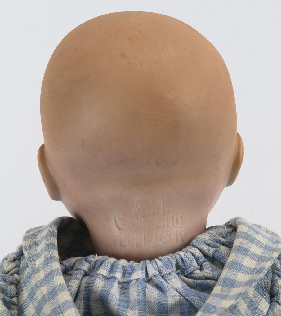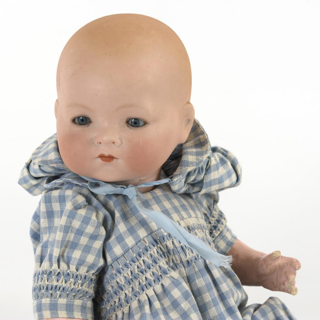 Full head, blue sleeping eyes, tinted hair base. 5-piece sitting baby body. Blue and white plaid suit, matching hood. Head without visible defects. Fingers and feet bumped.