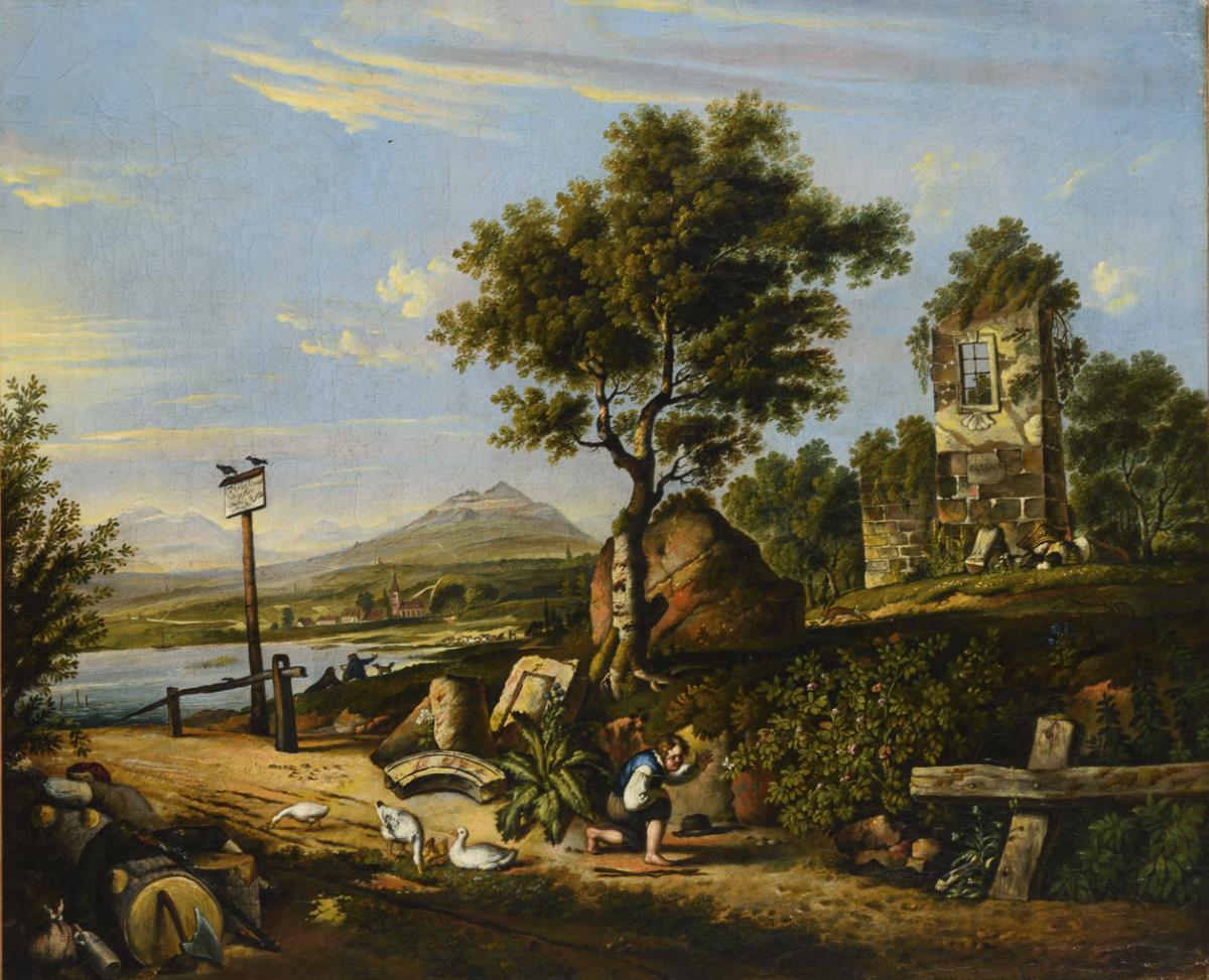 Resting woodworker, playing boy and architectural fragments in the foreground and sign: "Forbidden way for thieves ... Punishment." On the right a ruin with (Hebrew?) inscription, on the lakeside a painter with spectator as well as view into the mountain landscape. Crackled, minimally retouched.