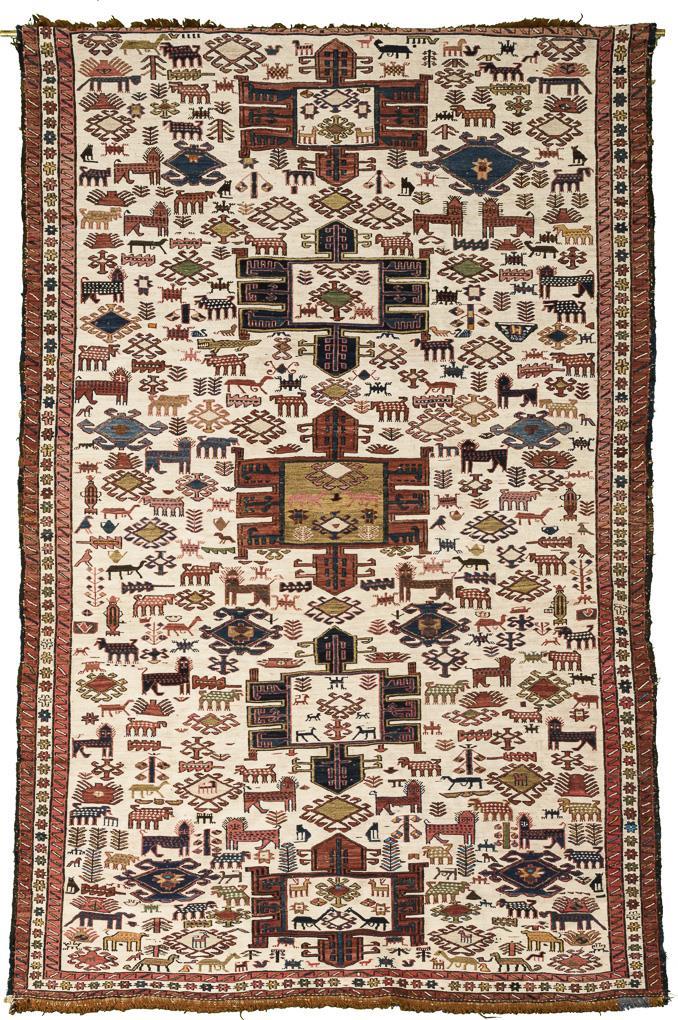 Woven carpet in concurrent and counter-current sumakh technique with intermediate weft. Wool and silk, polychrome decoration, with abrash. Approx. 195 x 121 cm.