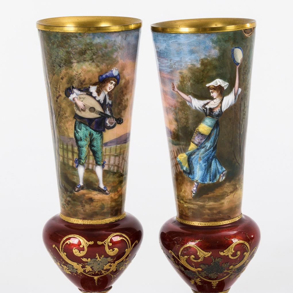 Pair of goblet vases with fine enamel painting.
