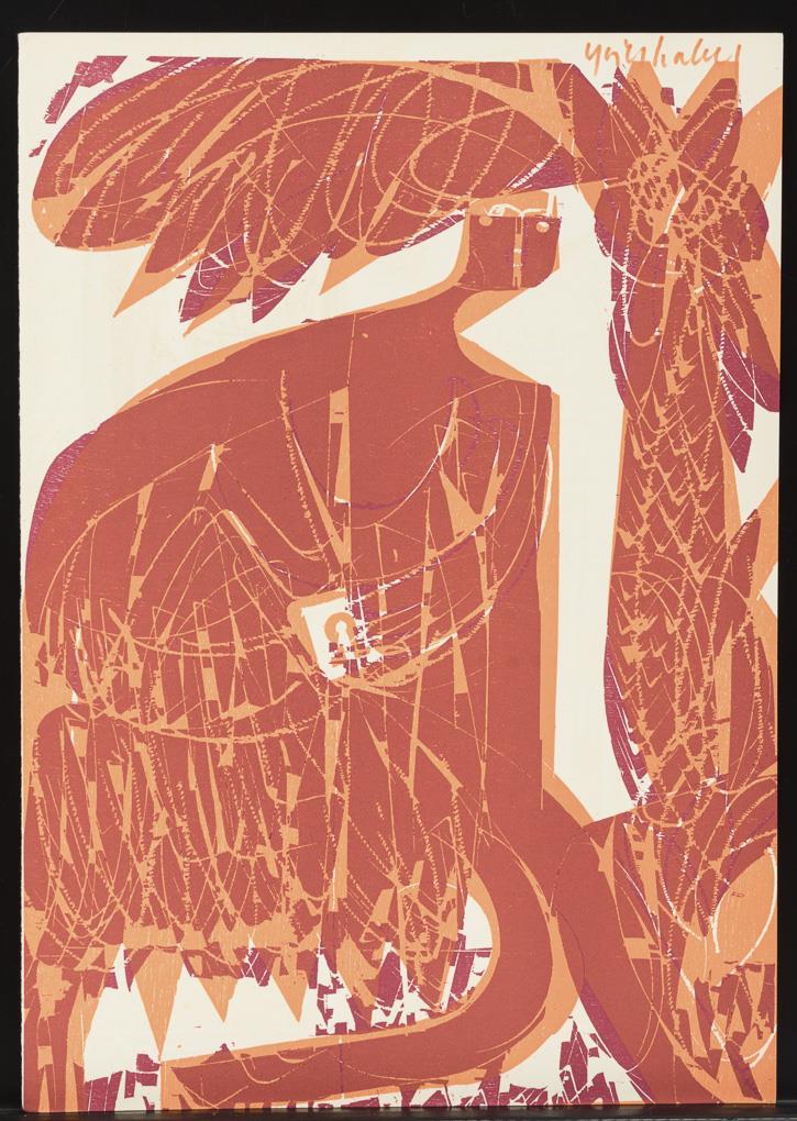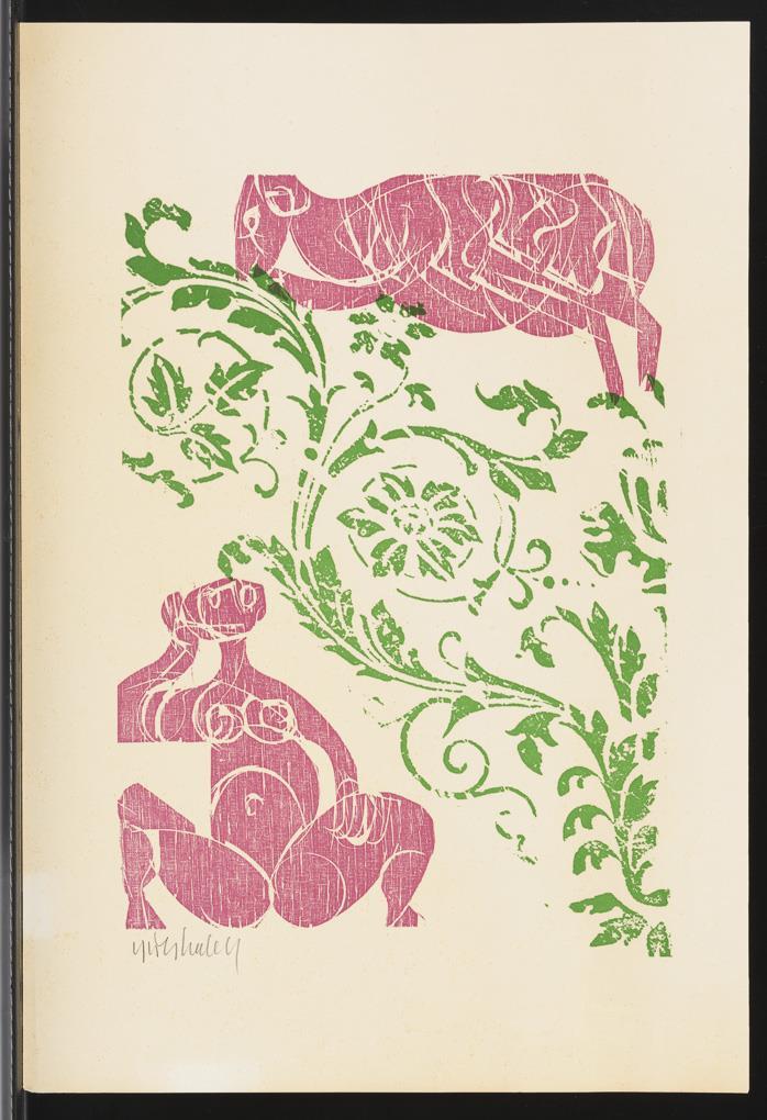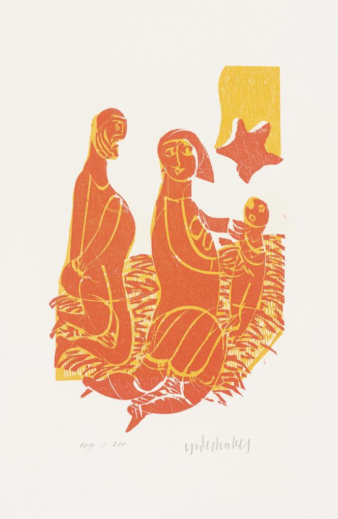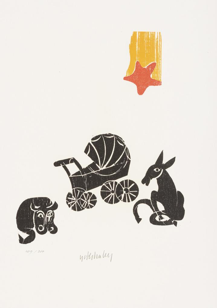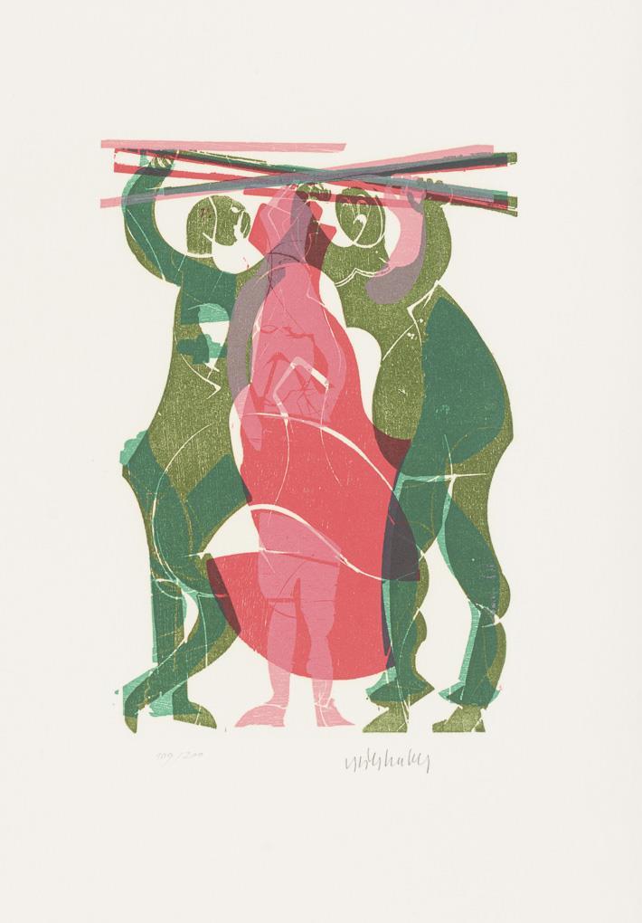 Man with ladder, sheet: 26 x 19 cm, unsigned | Female nude with sheep, sheet: 39,5 x 27 cm, some browning at margins | Abstracted figure, sheet: 44 x 31 cm, pen signature | Abstracted Battle Scene, sheet: 46 x 32.5 cm, copy: 109/200 | Mary and Joseph with Baby Jesus, sheet: 47 x 32.5 cm, copy: 109/200 and Donkey and Cattle with Baby Jesus, sheet: 47 x 32.5 cm, copy: 109/200.