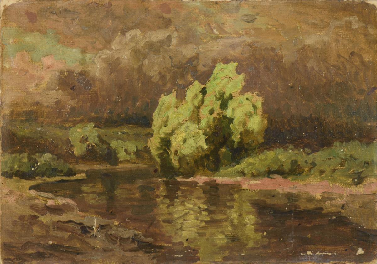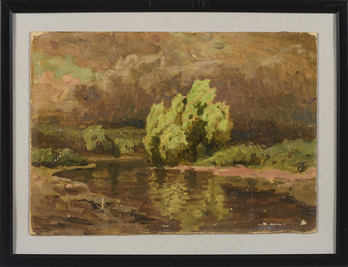 In light green executed group of trees at a river bend under cloudy sky. Light traces of age.