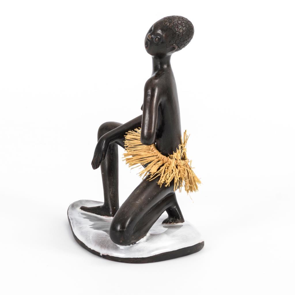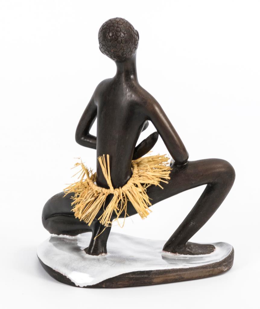 In Tanzhaltung kniende Afrikanerin mit Baströckchen, auf flachem Sockel. Minimal berieben.