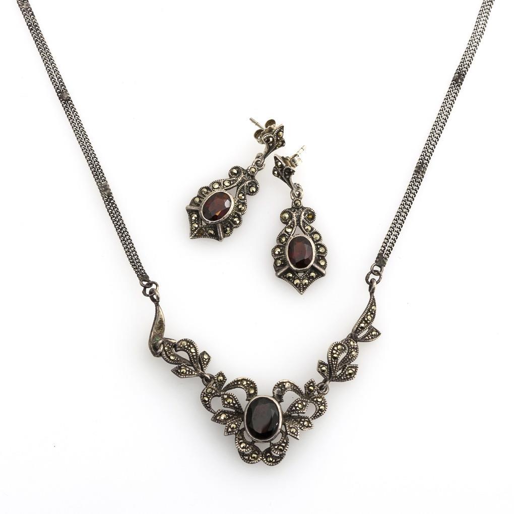 Marcasite set show piece and pair of ear studs with garnets. 2-row curb chain with ring spring clasp. Plug-in mechanism.