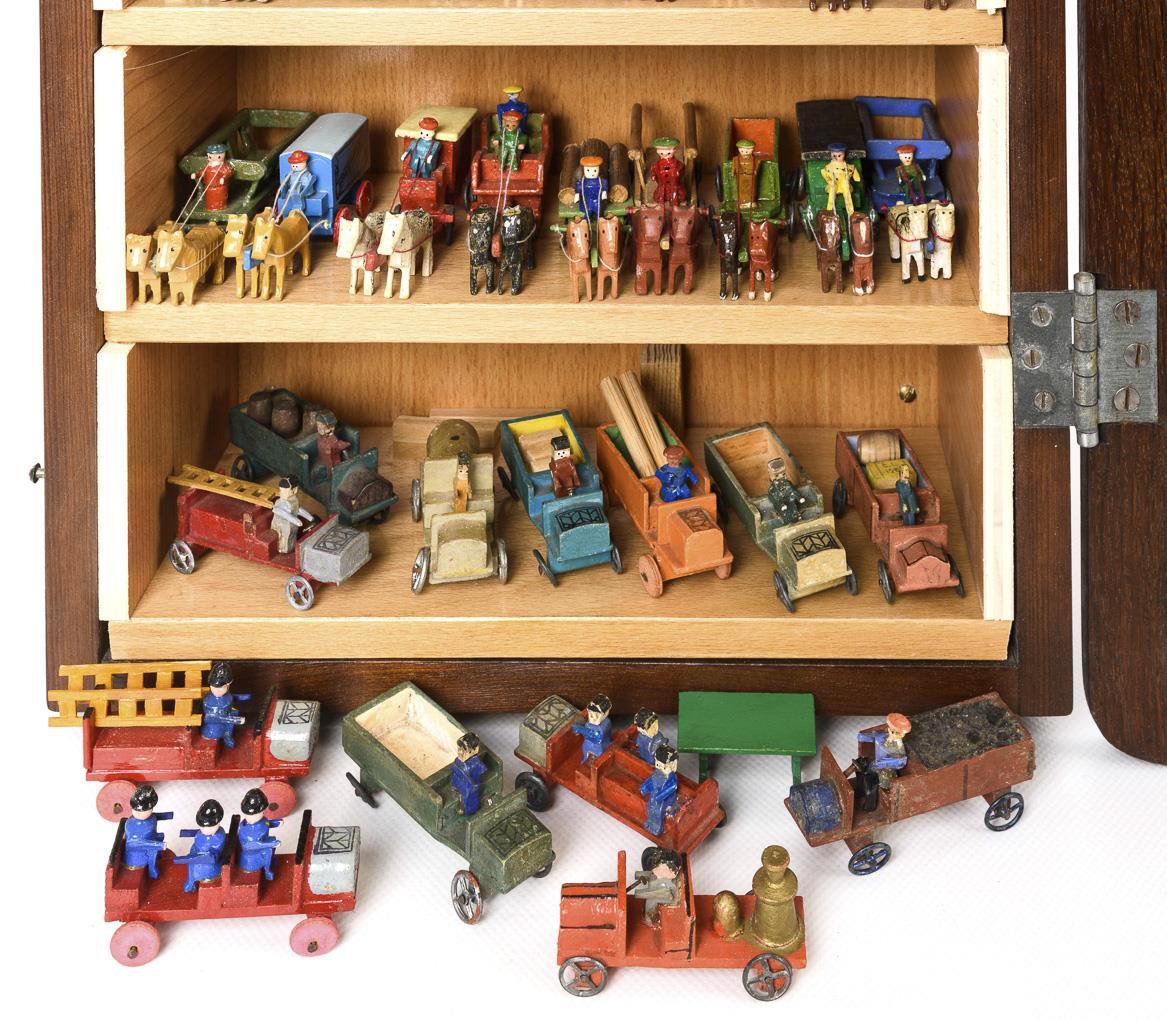 Display case with glazed oak door. In it about 50 Erzgebirge miniatures, including numerous carts and vehicles, 1 Ferris wheel, 1 carousel, 1 miniature dollhouse etc. Slight signs of age.