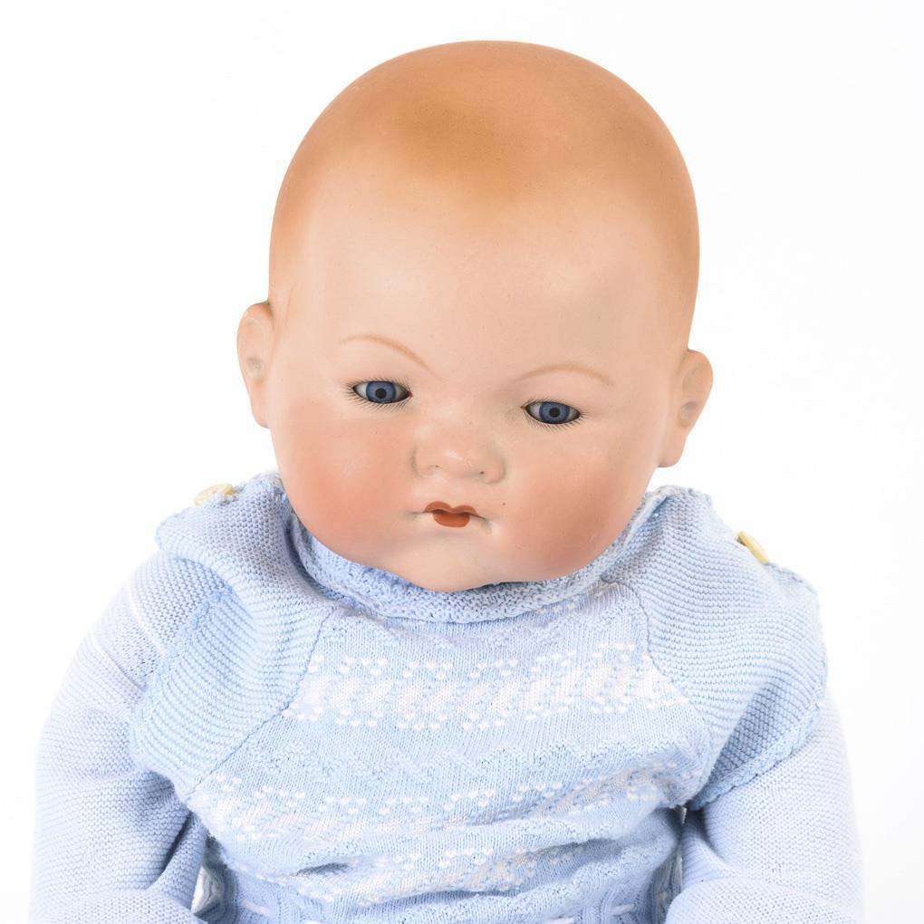 Binding head, blue sleeping eyes, tinted hair base. Fabric body with print voice and tie-in hands made of mass. Blue romper. Head without defects, body dirty, left hand with dry tear and repair.
