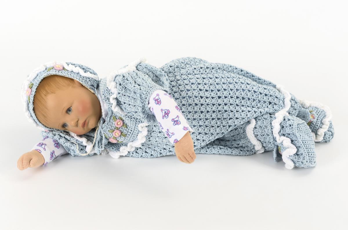 So-called sand baby or learning baby for midwives and nurses. Weighted version with open eyes, navel and butt hole. Light blue romper and crocheted clothing with cap and shoes. Good, probably unplayed condition.