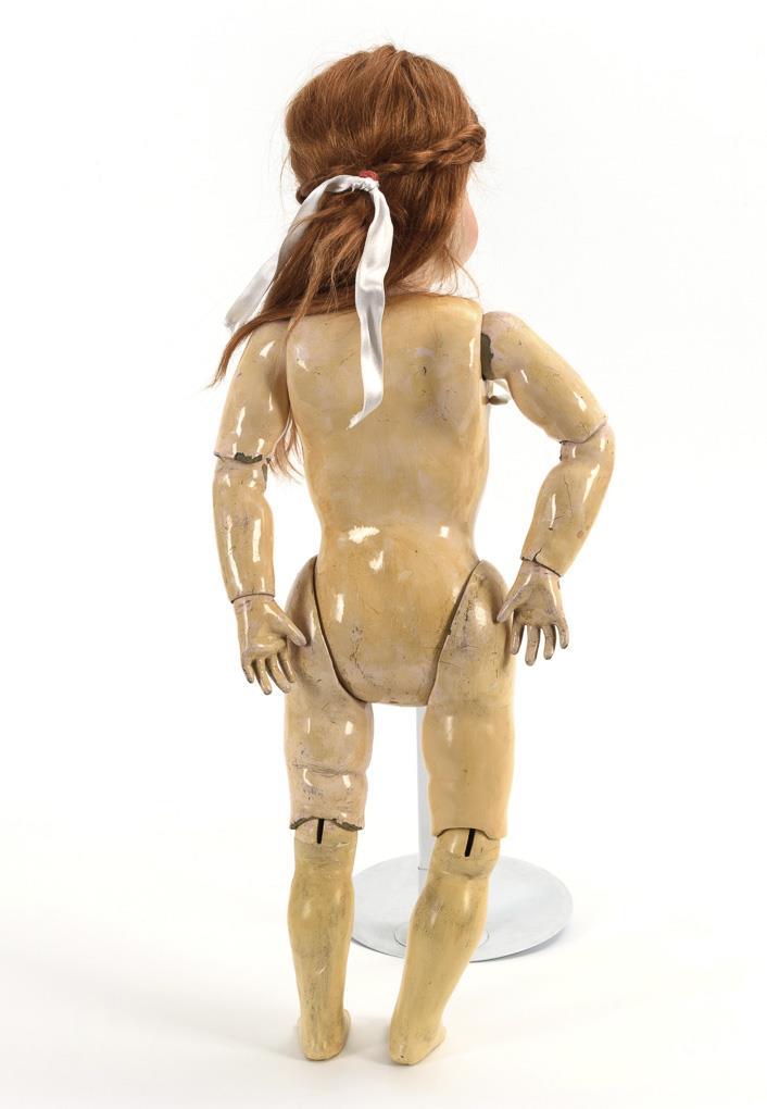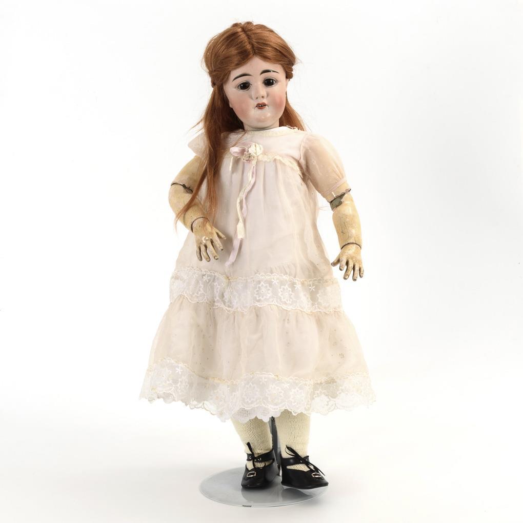 Crank head, replastered brown glass eyes, long red synthetic hair wig. 11-piece limb body in toddler style. Delicate pink dress, white undergarment, stockings and black shoes. Hairline crack on forehead, body with signs of age and small repair spots.