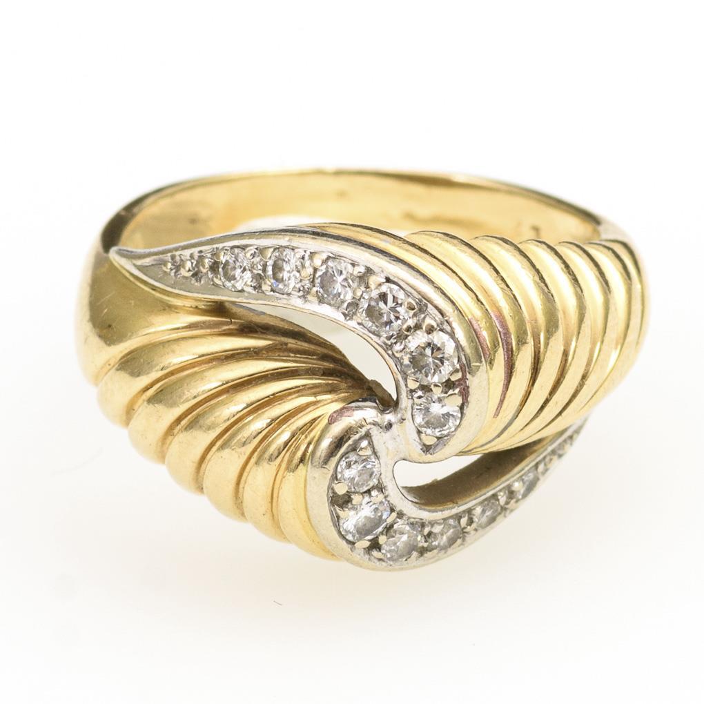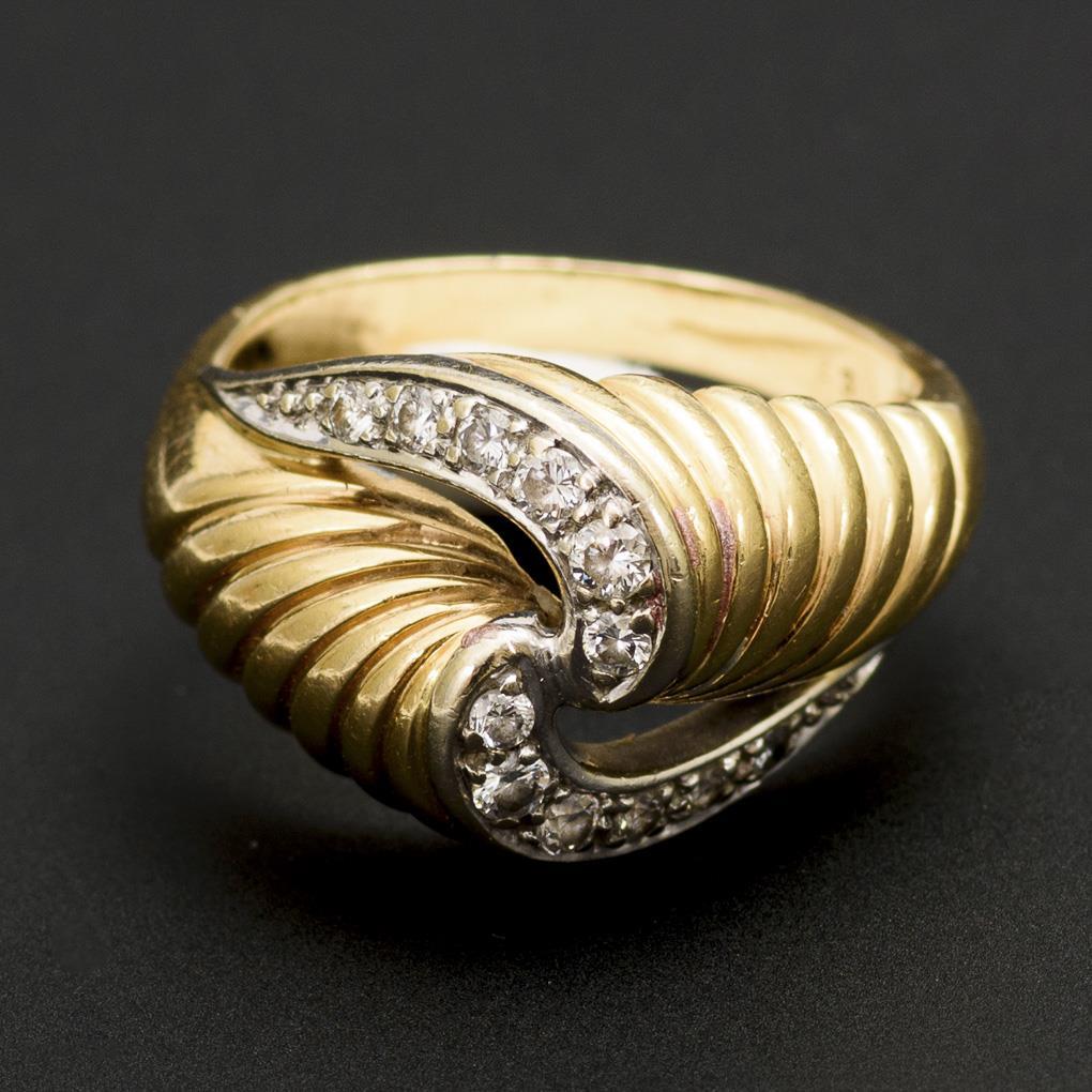 Tested yellow gold / white gold 585. Indistinctly hallmarked. Ring size 51. Diamonds total 0.23 ct. 5.0 g.