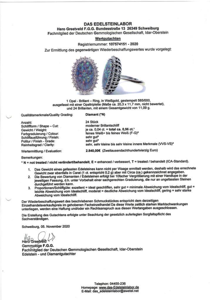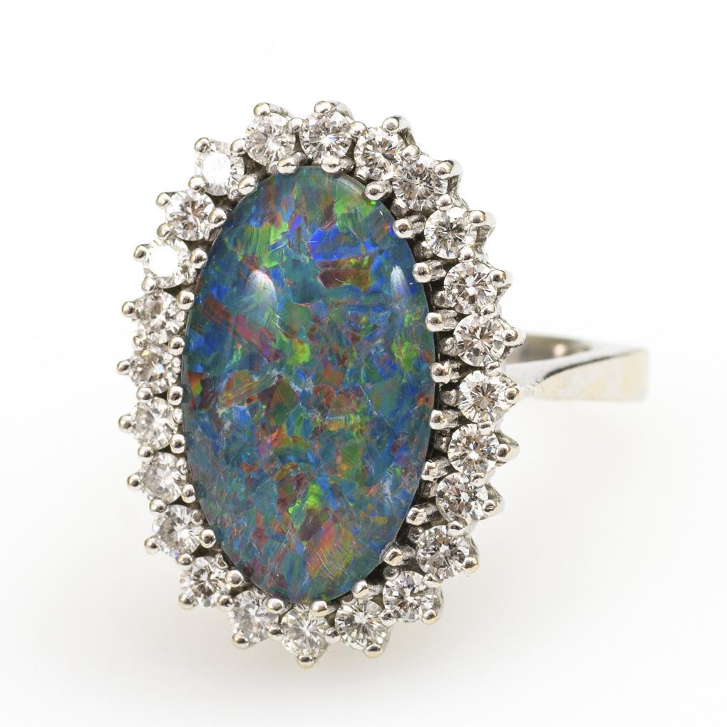 Opal triplet surrounded by 24 chaton set diamonds, between center rail.