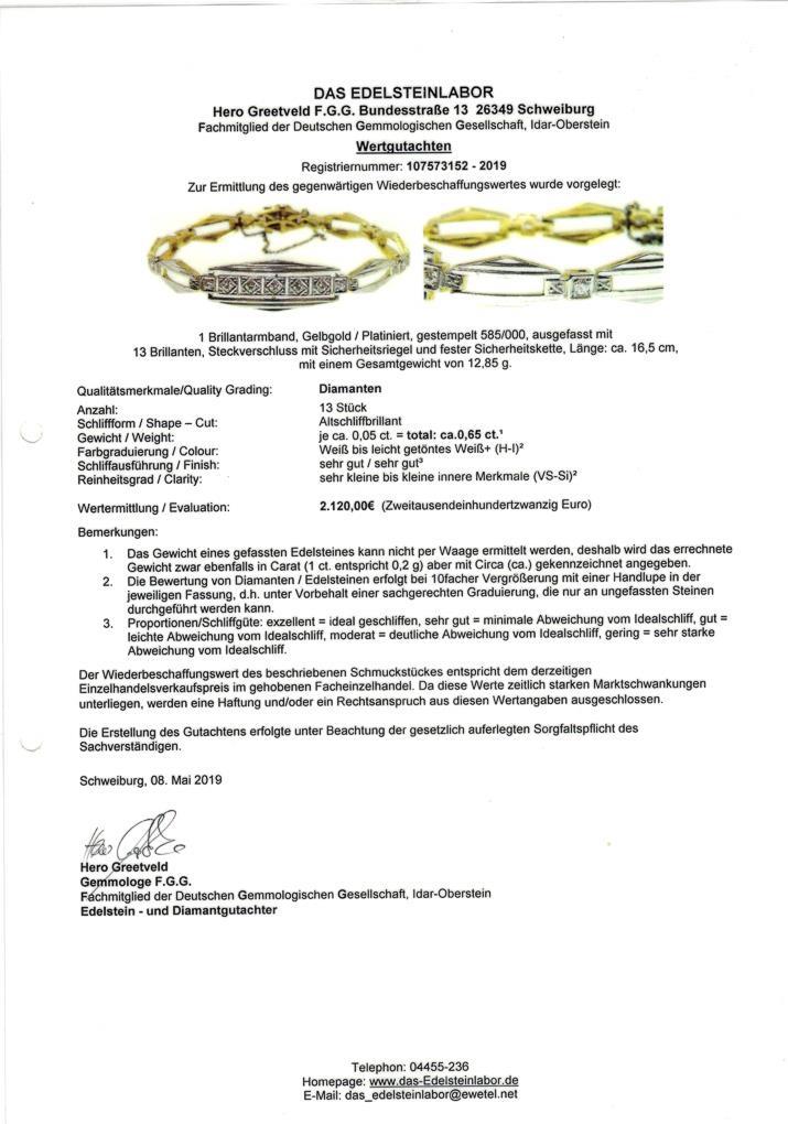 Yellow gold 585 stamped, platinum plated. Diamonds total approx. 0.65 ct. L 17 cm. 12,85 g.