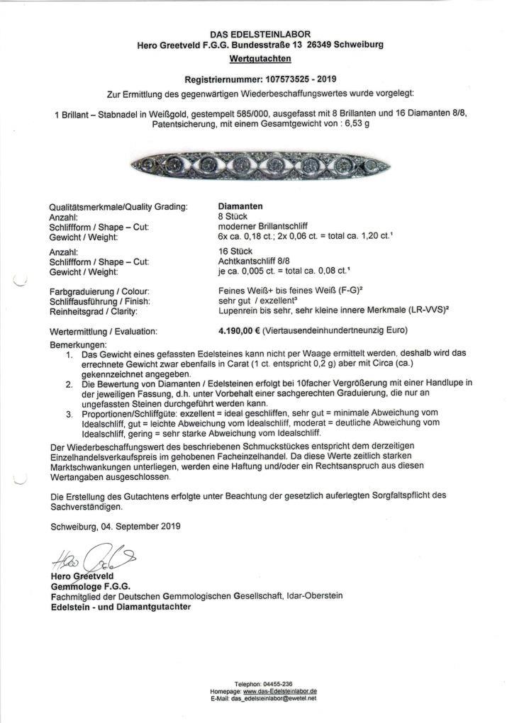 Stamped white gold 585. 6,5 x 0,7 cm. Diamonds total approx. 1.20 ct. 16 diamonds total approx. 0.08 ct/F-G/lr-vs. 6.53 g.