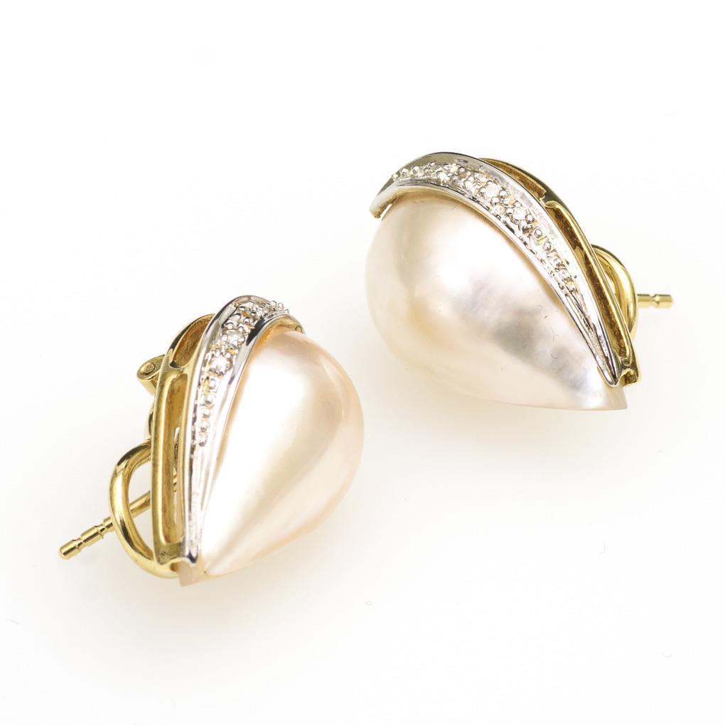 Front-set mabé cultured pearls and 4 each of embedded micro diamonds on pin/clip mechanism.