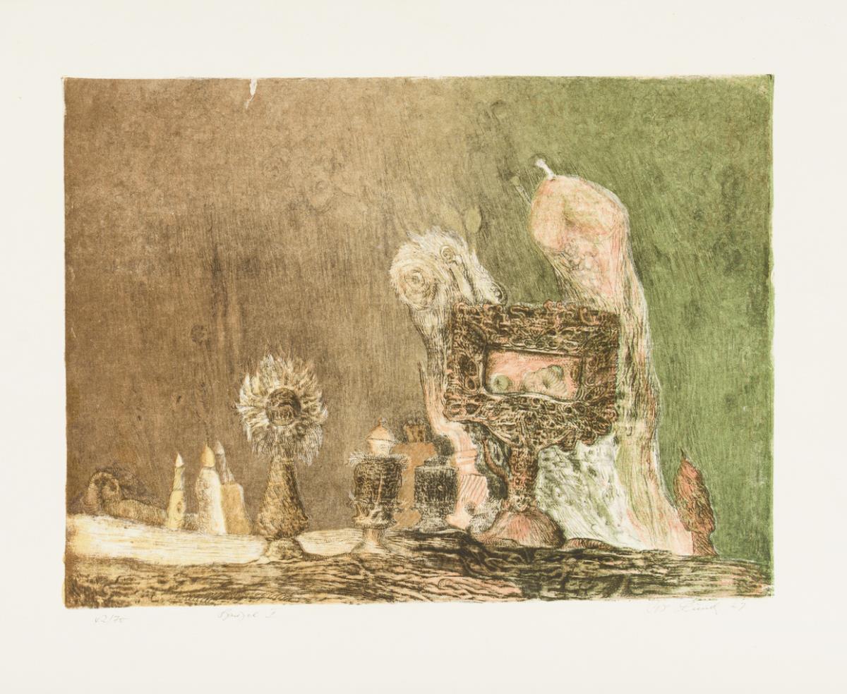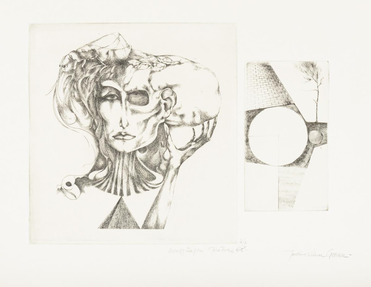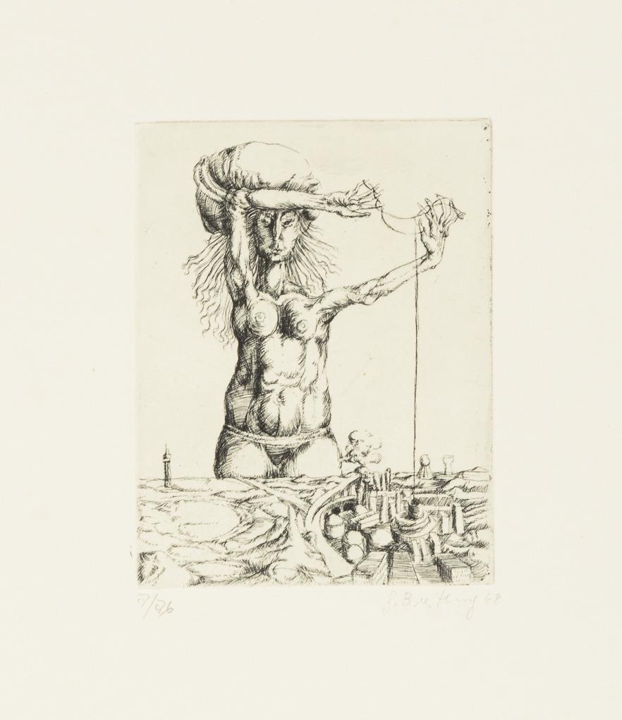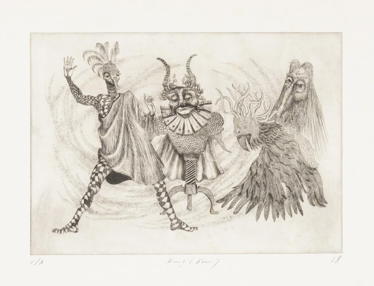 19 surrealist works by various artists, including 4 etchings by Gisela Breitling (1939 - 2008), 3 lithographs by Peter Collien (b. 1938), 4 lithographs by Werner Hilsing (b. 1938), 2 indistinctly signed color etchings with surrealist creatures, 1 lithograph by Werner Pöschel (also Petit Frère, 1927 -2002) and 4 other indistinctly signed works.