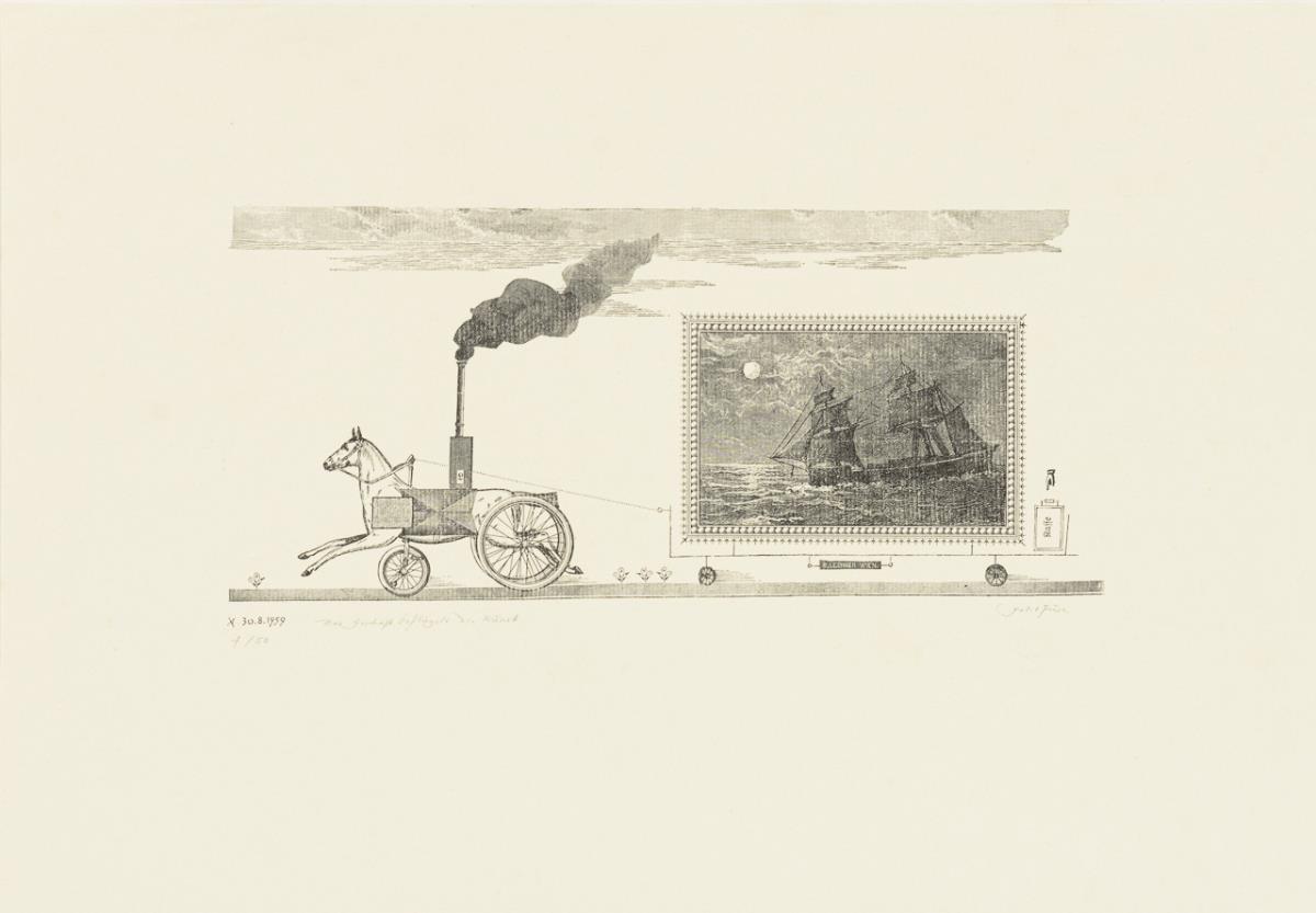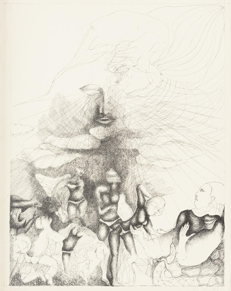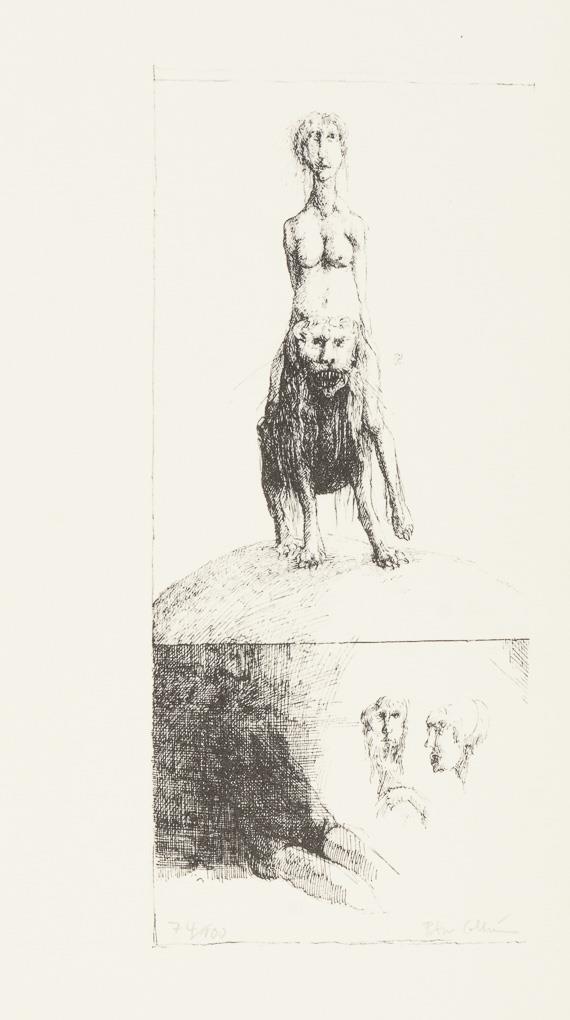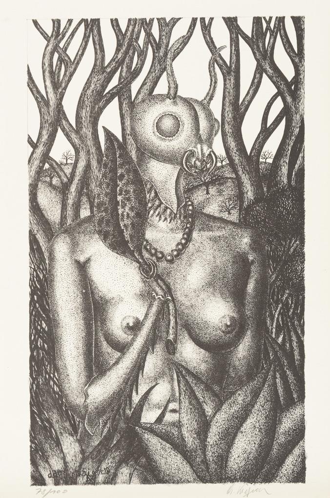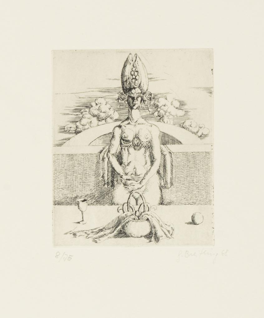 19 surrealist works by various artists, including 4 etchings by Gisela Breitling (1939 - 2008), 3 lithographs by Peter Collien (b. 1938), 4 lithographs by Werner Hilsing (b. 1938), 2 indistinctly signed color etchings with surrealist creatures, 1 lithograph by Werner Pöschel (also Petit Frère, 1927 -2002) and 4 other indistinctly signed works.