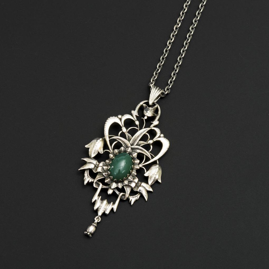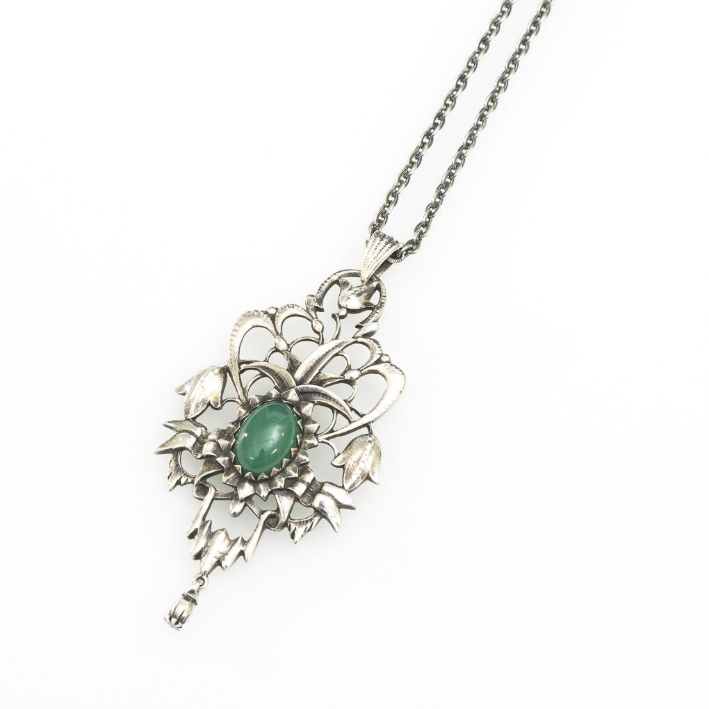 Large pendant with green agate on chain, circa 1920.