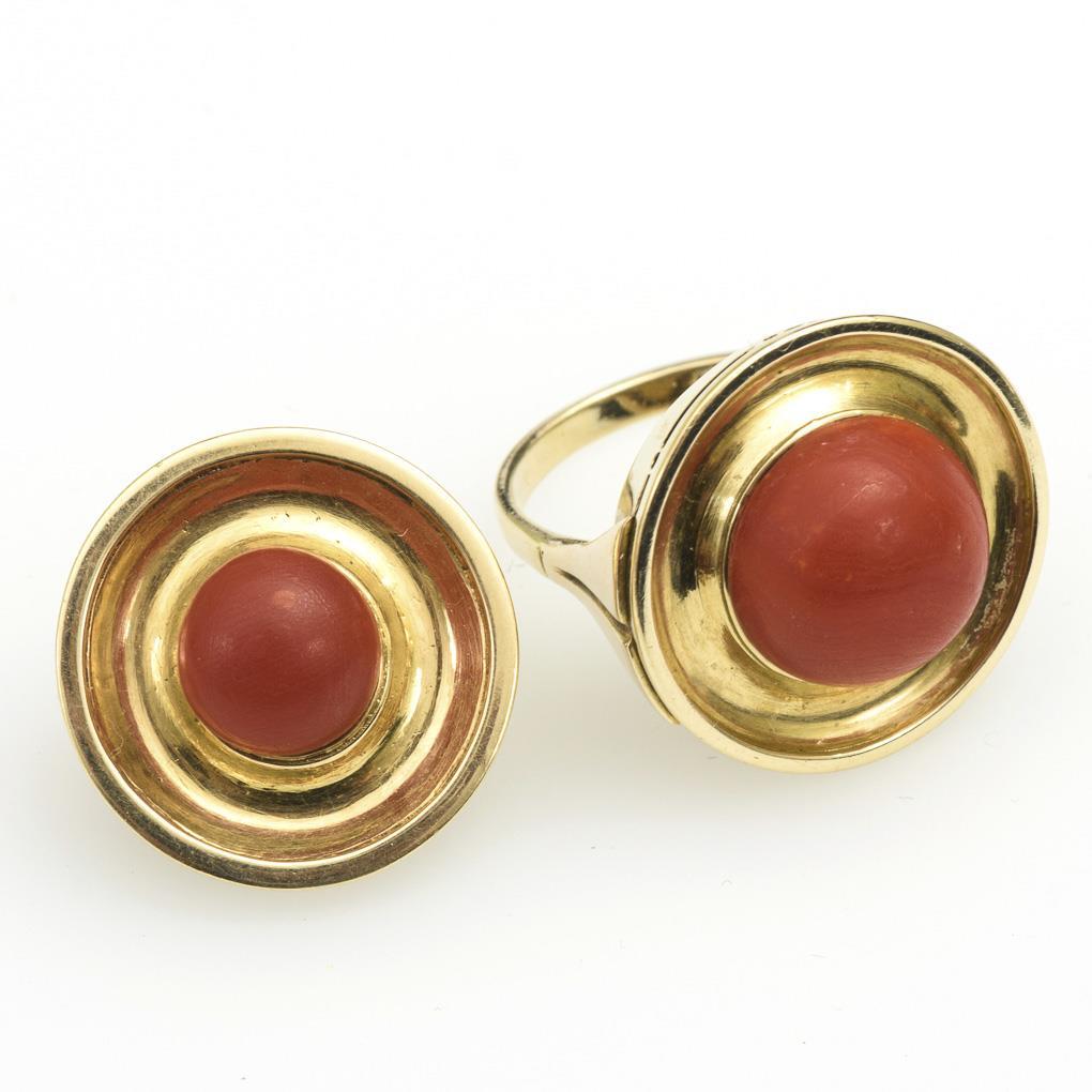 Ring and stud earrings with coral.