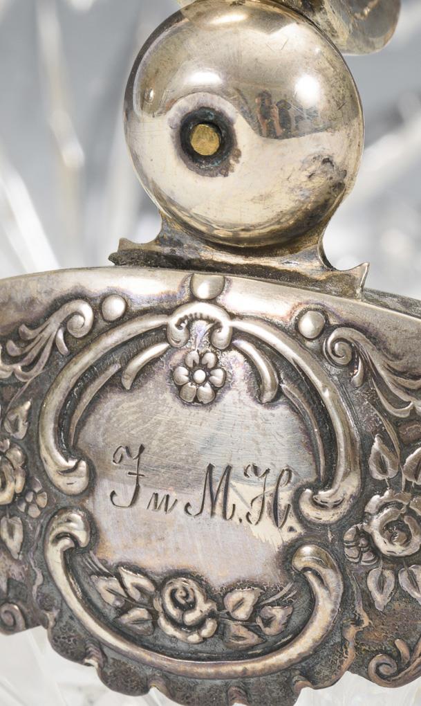 Heavy bowl with star cut and movable silver handle. Monogrammed and dated on the sides: "I u. M. H., 21.2. 1937", on the handle monogram engraving "RU".
