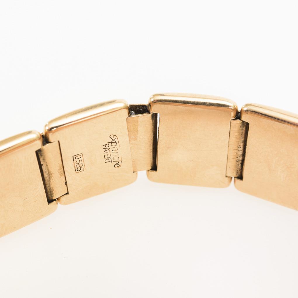 Round case (Ø 3.6 cm) on Expandro pull link bracelet, hallmarked 585, Ø ca. 17 cm. Signs of age and wear.