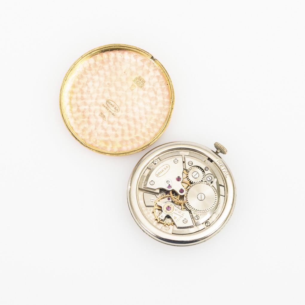 Movement with lever escapement and crown winding, running. Gold dial with Arabic numerals, minute crown, leaf hands and central seconds, marked "Doxa, Antimagnetique".