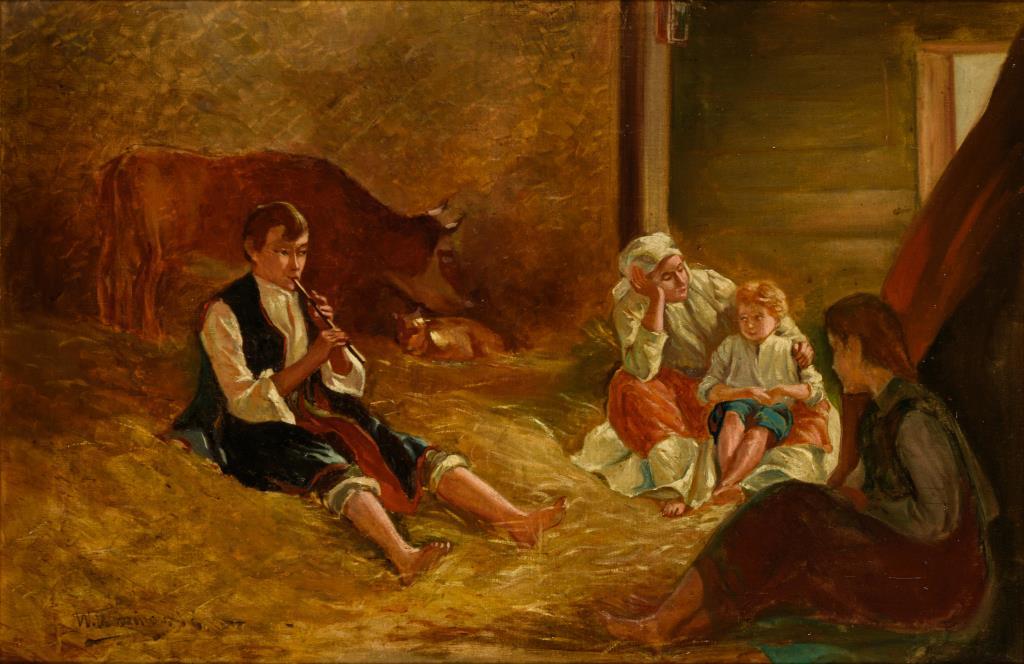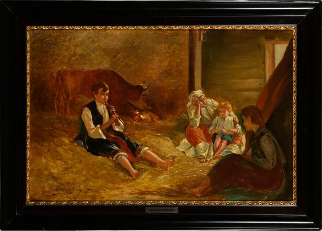 Die Mutter mit den Kindern im Stall mit den Tieren beim Lauschen des Flötenspiels. Anbei polnische Expertise der unabhängigen Gutachterin Teresa Maria Pabis, Krakau. Zwei kleine restaurierte Stellen mit Hinterklebung.