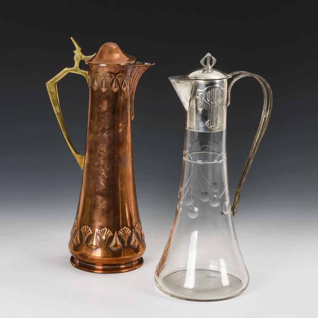 WMF copper jug with relief decoration. Glass jug with surrounding cherry branches and mounting with relief decor. Copper jug partly more dented, silvering rubbed.