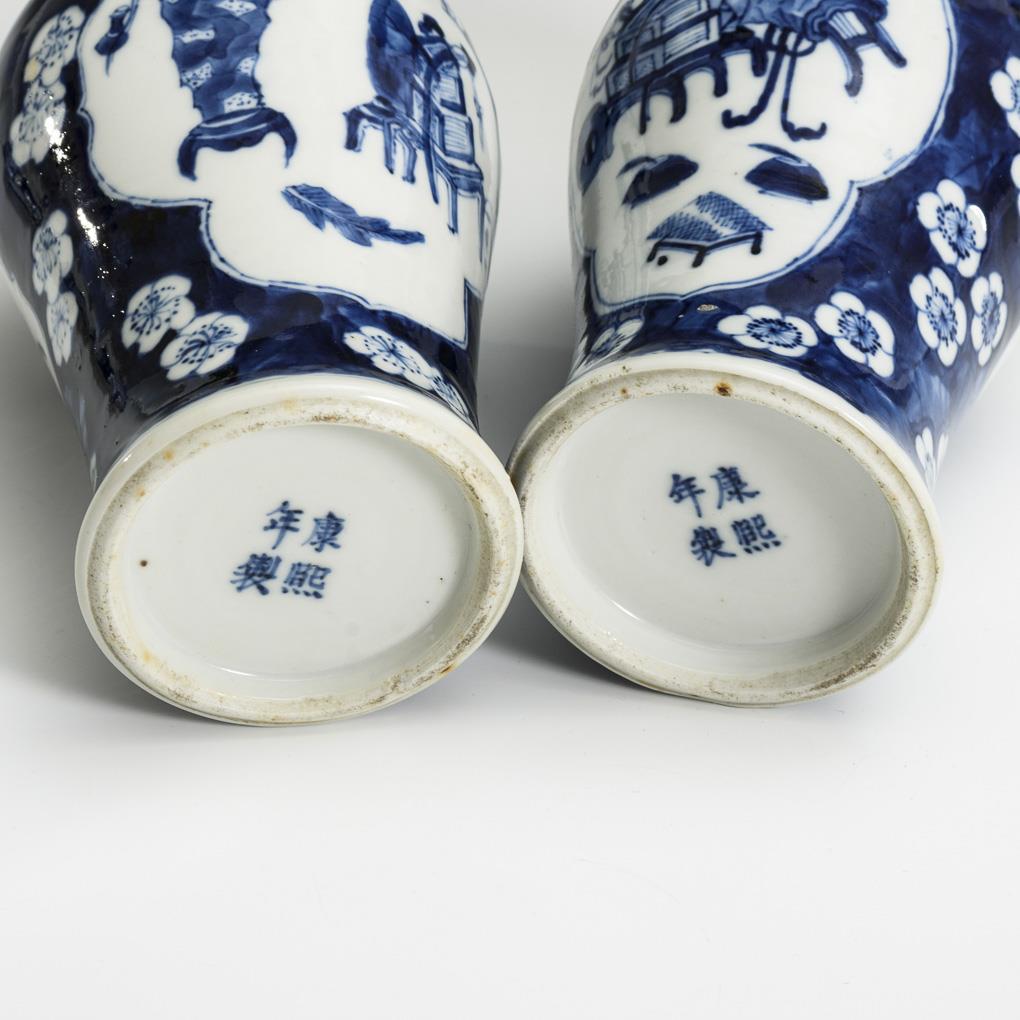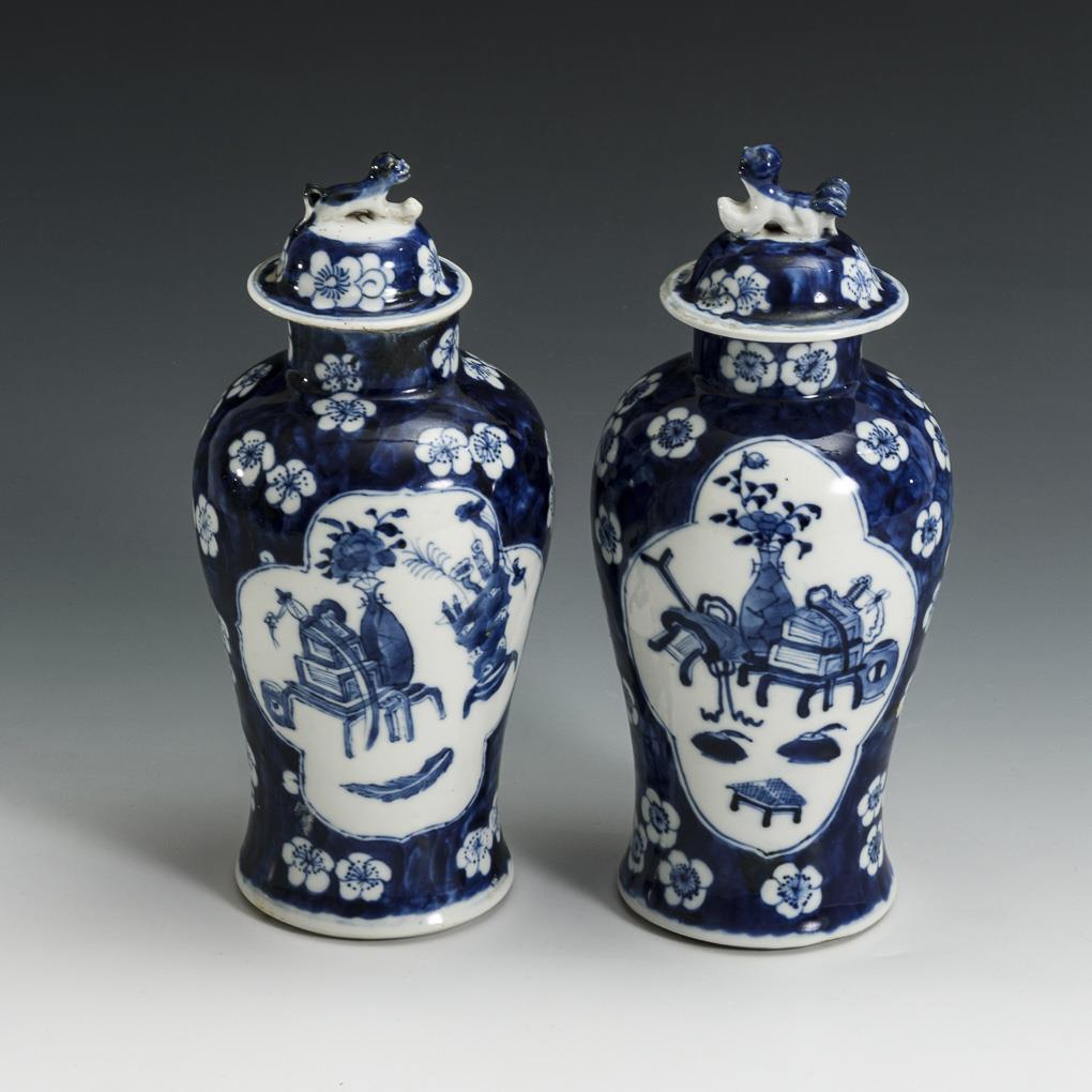 Baluster vases with pictorial cartouches, vase or table pieces within, bordered by plum blossoms. Hat lids with stylized fo lions. Both lids and both necks restored.