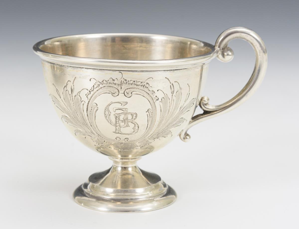 Silver vase, table bowl and cup with saucer.