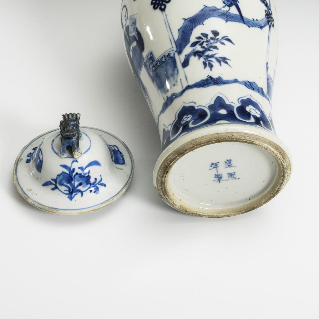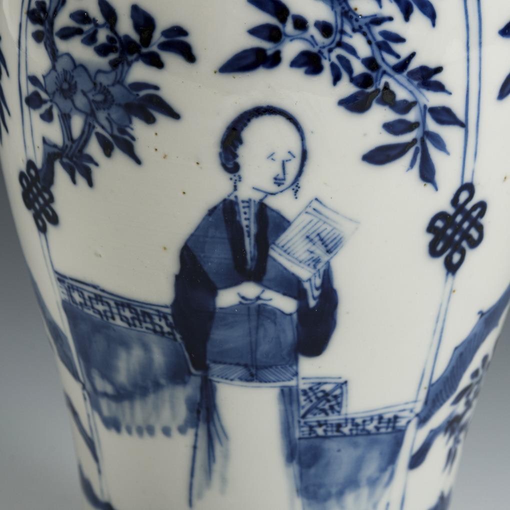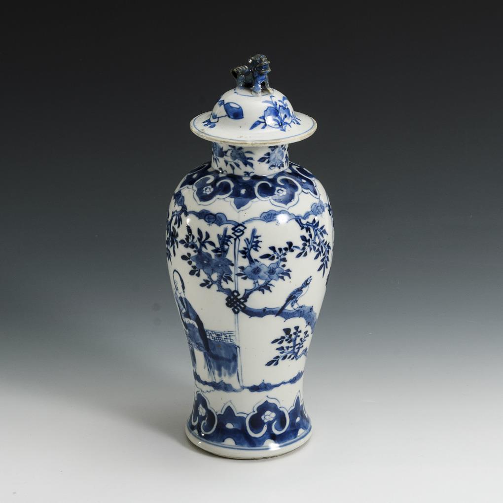 Wall divided into four finely painted pictorial cartouches. Reading lady and bird on branch. Lid with fo dog probably added.