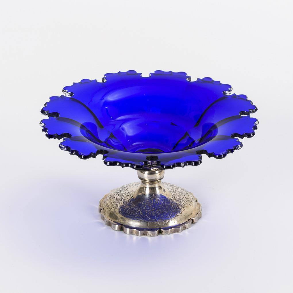 Faceted crater bowl with multi-pass rim, mounted silver foot with engraved floral decoration. Minimal rim bumping.
