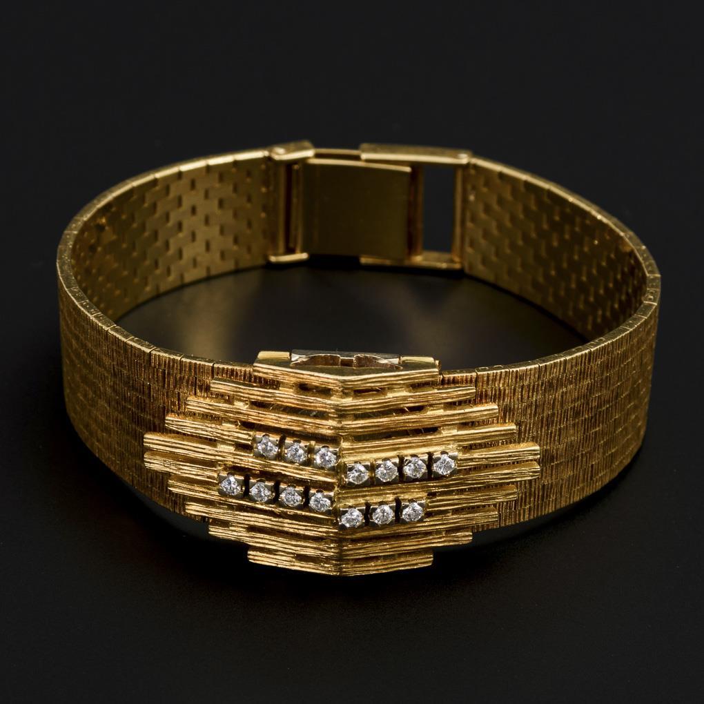 Round case with bright dial, dash numerals and feather crown between wide milanese band. Bar pierced cover with 14 small brilliant-cut diamonds. Clip clasp. Movement runs.
