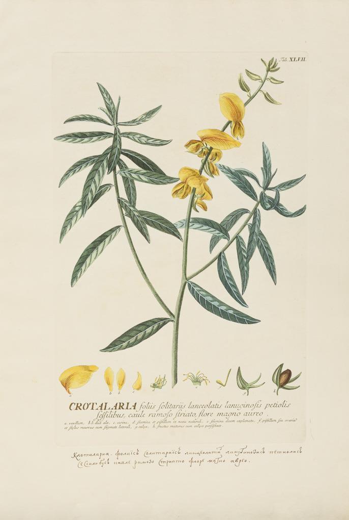 Plate XLVII "Crotalaria foliis folitariis lanceolatis [...]" with ink inscription in Greek by old hand, engraved by Johannes Jacob Haid; from Christoph Jacob Trew's "Plantae selectae quarum imagines ad exemplaria naturalia Londini, in hortis curiosorum nutrita", 1750 - 1773. Somewhat stained and with traces of handling.