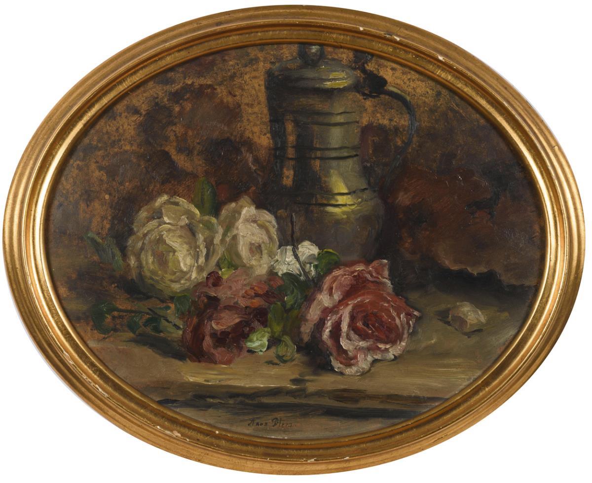 Oval Still Life with Roses and Pewter Pitcher