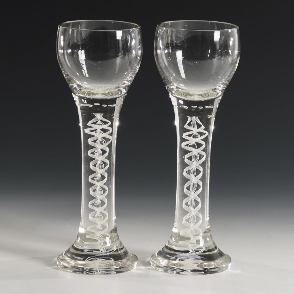 Bellied cup with pierced bubble wreath at base, solid long stem with enclosed double helix of white glass threads, round foot with dislocated break. 1x minimal rim bump.