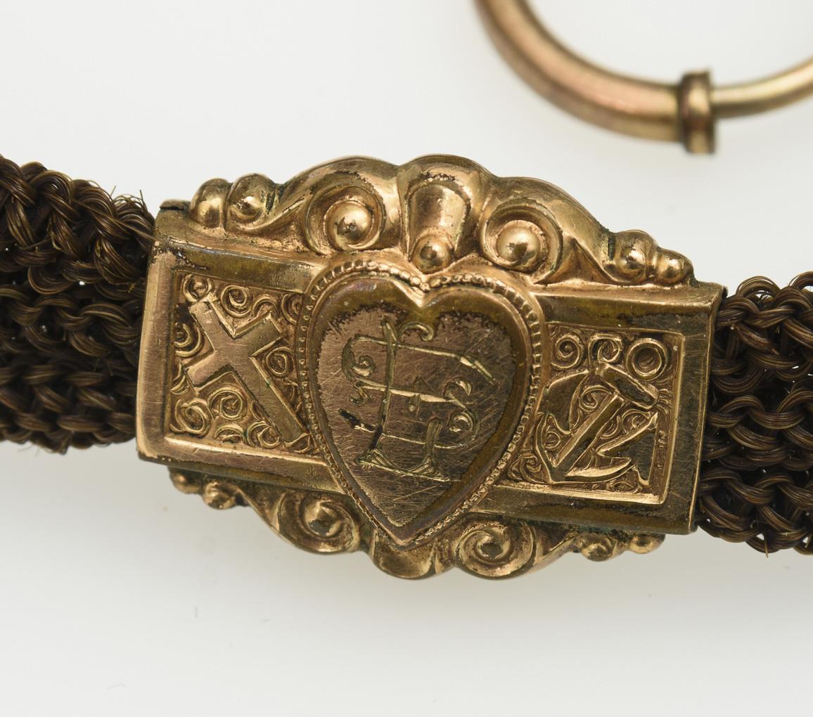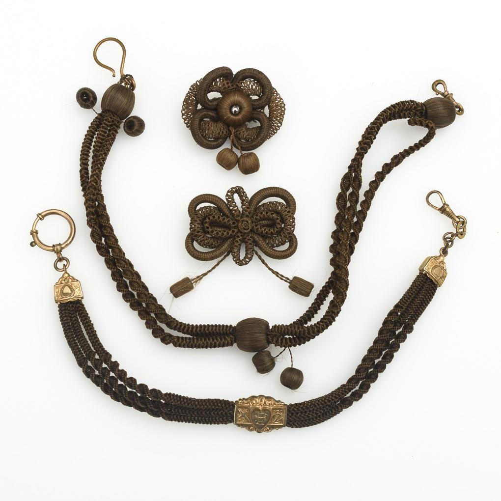 2 knotted watch bands with mounting in partial relief on ring spring clasps and carbines. 2 elaborate brooches with metal brooches.