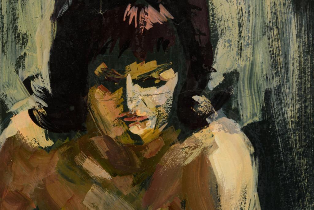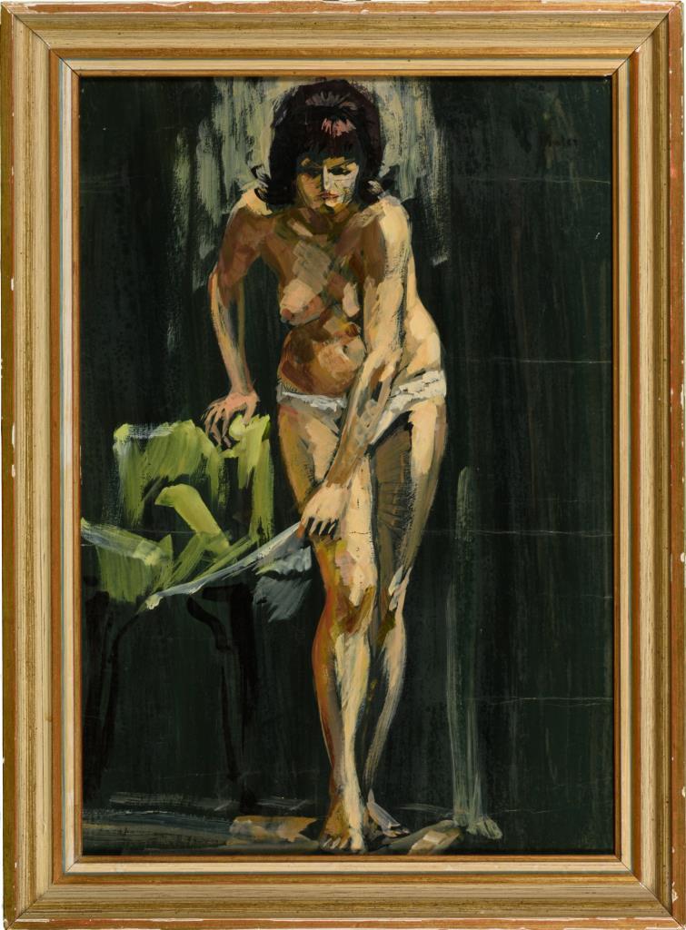 Frauenakt mit weißem Slip vor dunklem Hintergrund. Altersspuren.