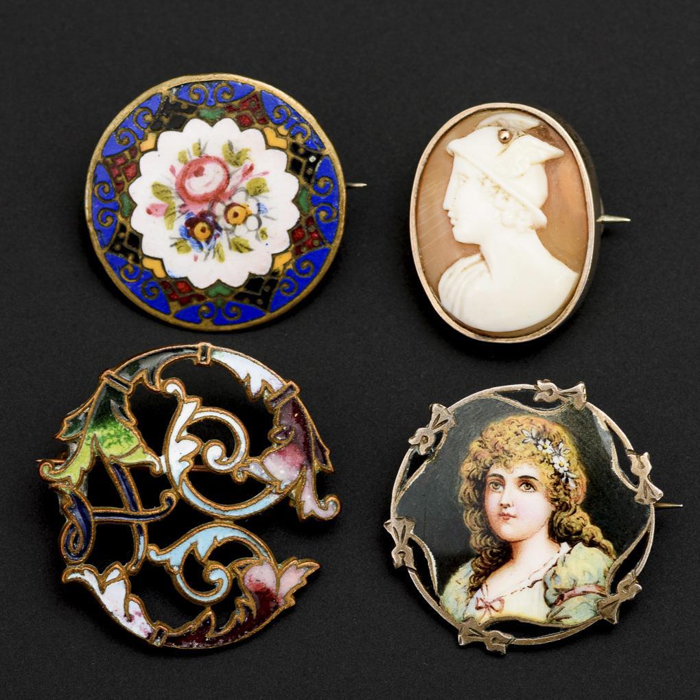 3 enamelled brooches and shell cameo brooch with antique cut Hermes profile head. Hook clasps.