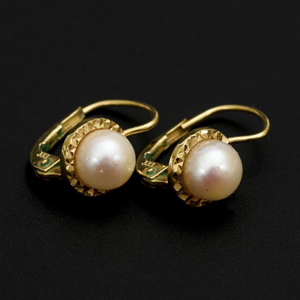 Yellow gold 585 stamped. L 1.5 cm. Pearl Ø 0.5 cm. 2,2 g.