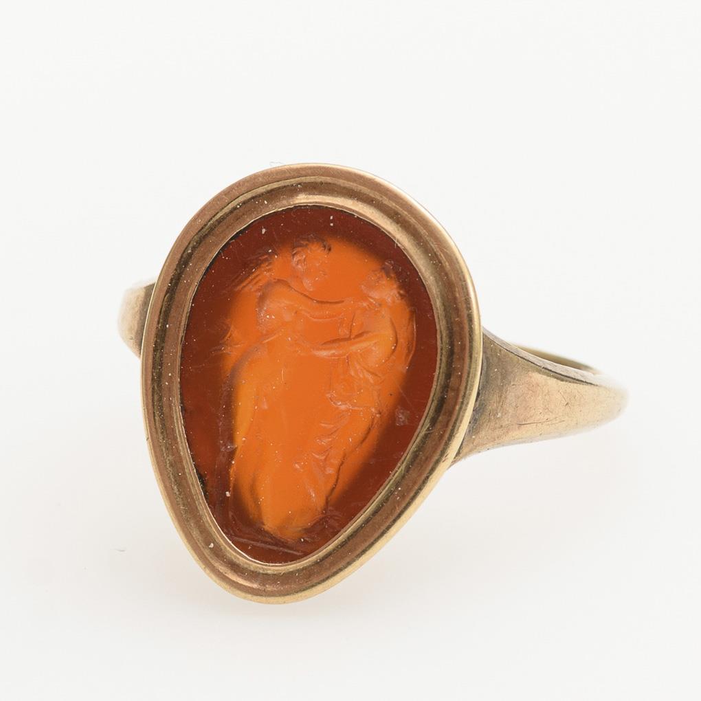 Carnelian tablet set in open frame with antique cut motif of Cupid and Anteros. Narrow rail.