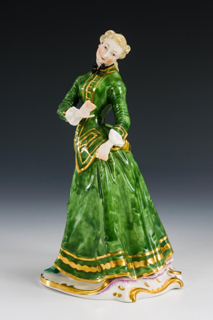 Junge Dame auf einem Rocaillesockel, die Linke abwehrend erhoben. Bestoßung am Sockelrand.