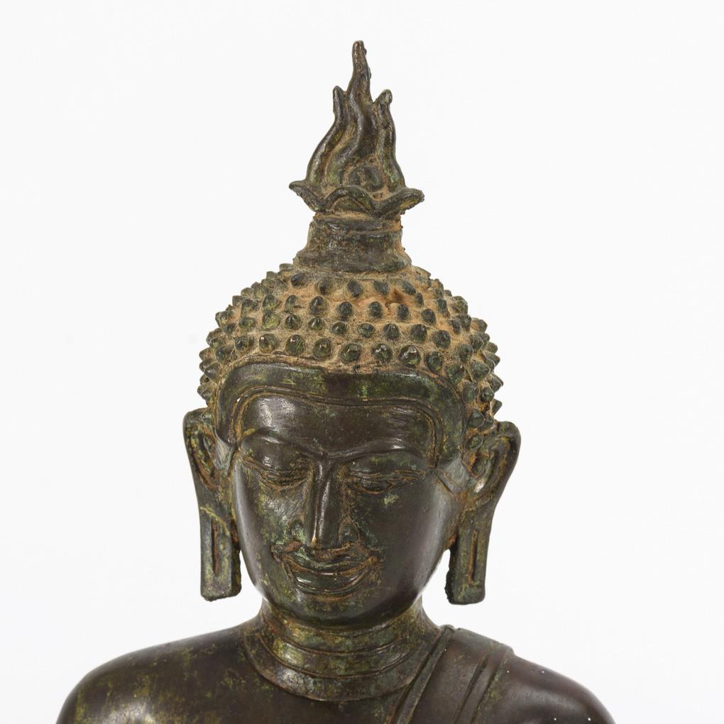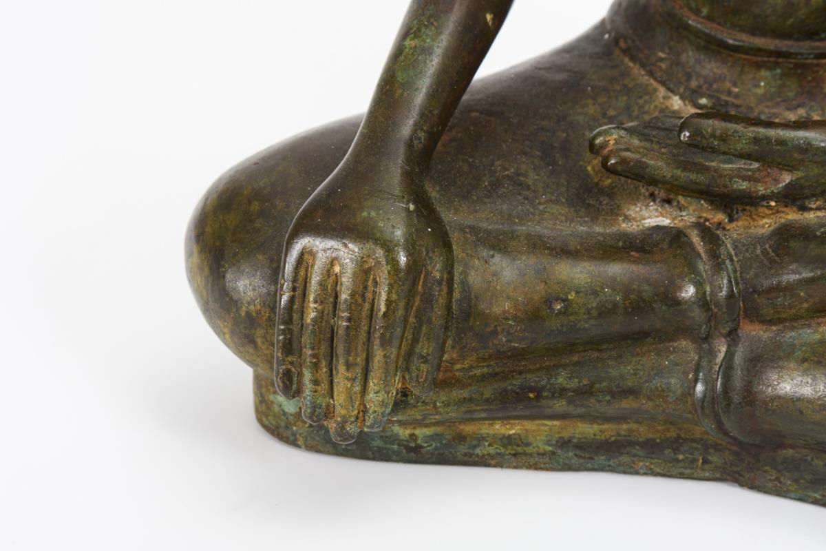 Simple figure in interlocking seat with gesture of touching the earth. Base open at the bottom.
