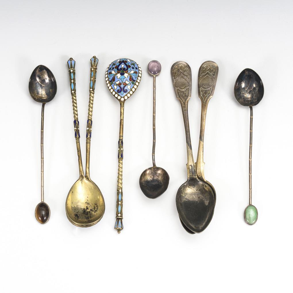 Various spoons: 3x enameled, 3x with semi-precious stone, 2x with ornamental decor. Signs of age and use, 1x missing enamel.