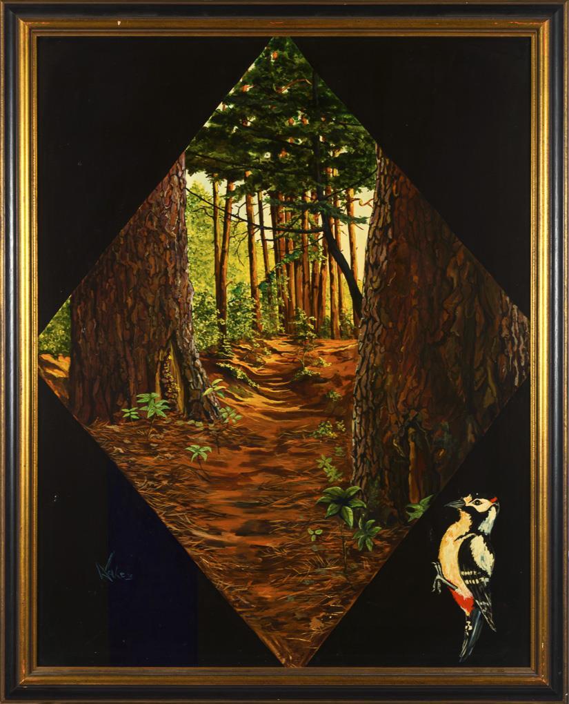 Photorealistic view into the forest with rhombic image detail and fretted woodpecker in a spandrel.