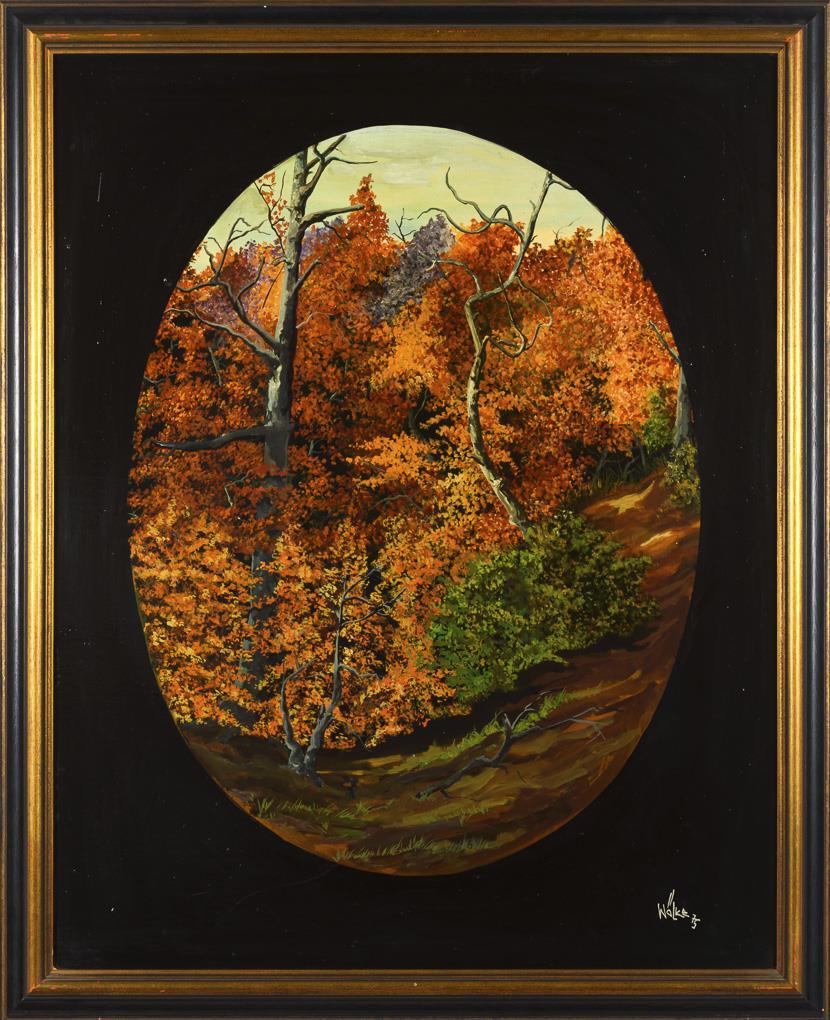 Bright autumn colors of the forest with oval image. 1 small dent in the black.