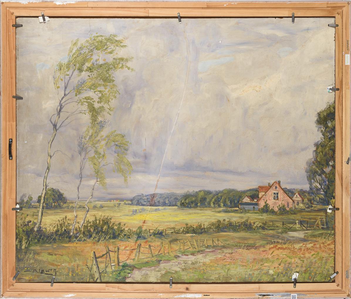 Gentle valley with birch and rows of trees in winter. Verso wide spring landscape with homestead. Barely retouched on both sides, verso large scrape.