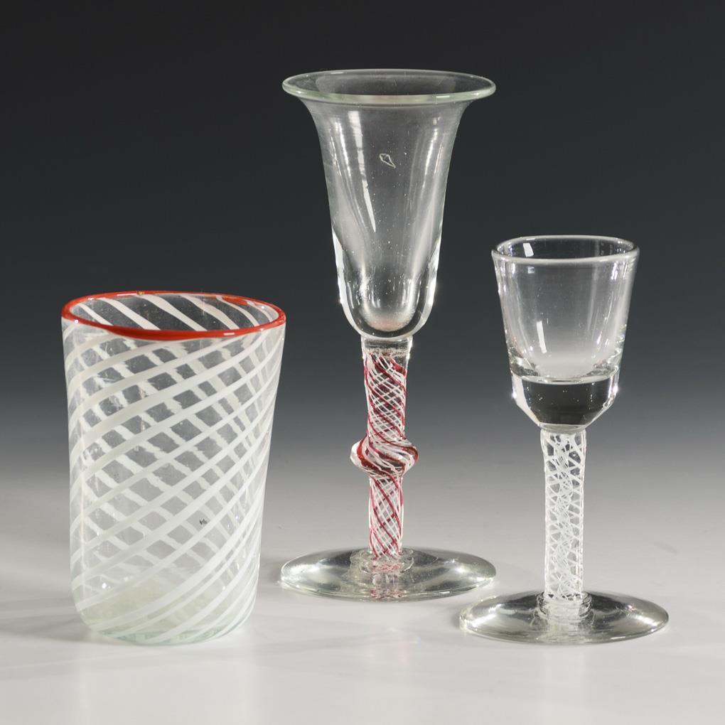 1x cylinder mug with spirally fused white threads and fused red thread on the rim, demolition (h 10 cm). / 1x shot glass with conical dome, melted white spiral thread in the stem and round foot, with demolition (h 12,5 cm). / 1x Shot glass with crater dome, fused red and white spiral threads in the stem and round foot with demolition (H 16 cm).