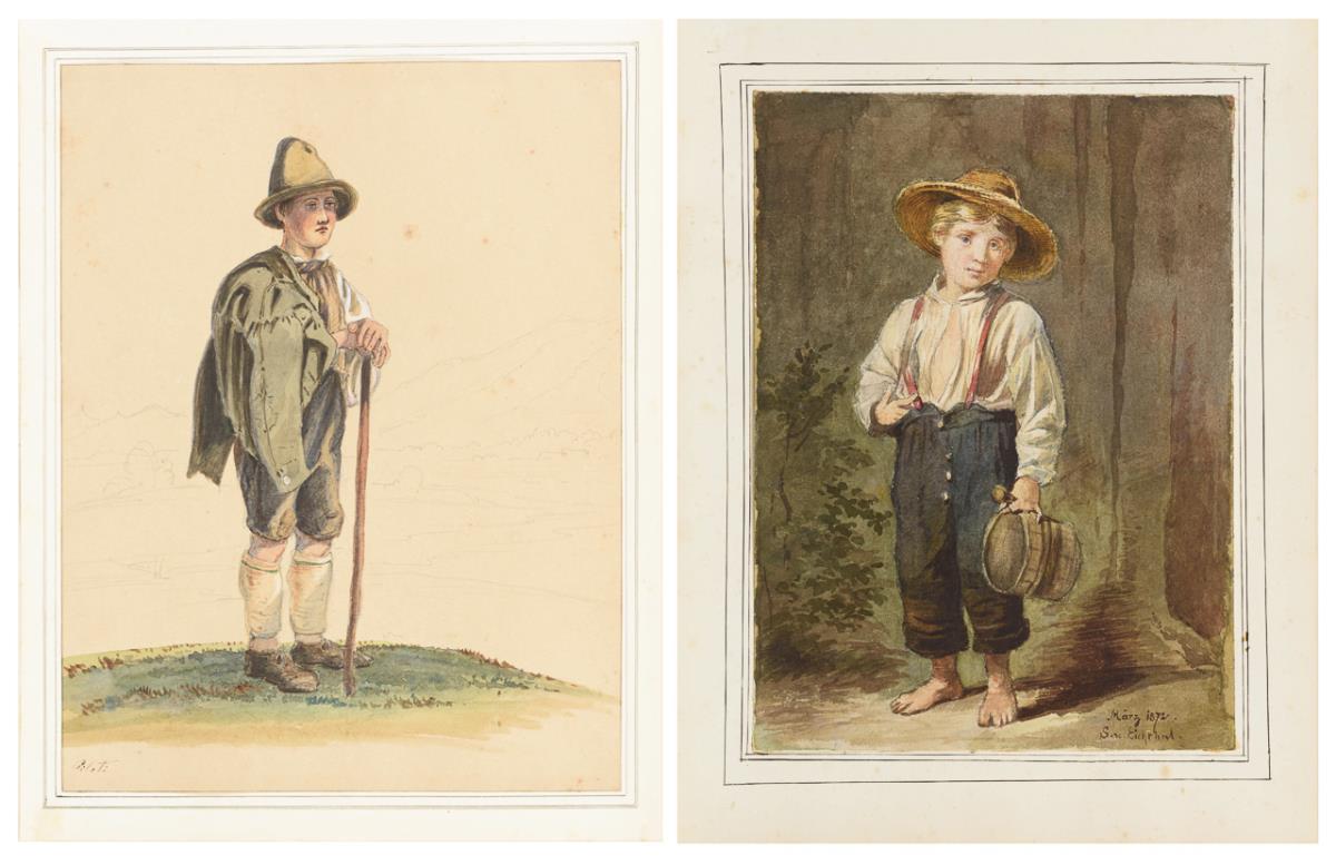Young shepherd boy in alpine dress in mountainous country as well as small boy with bucket and summer hat. Light traces of age.